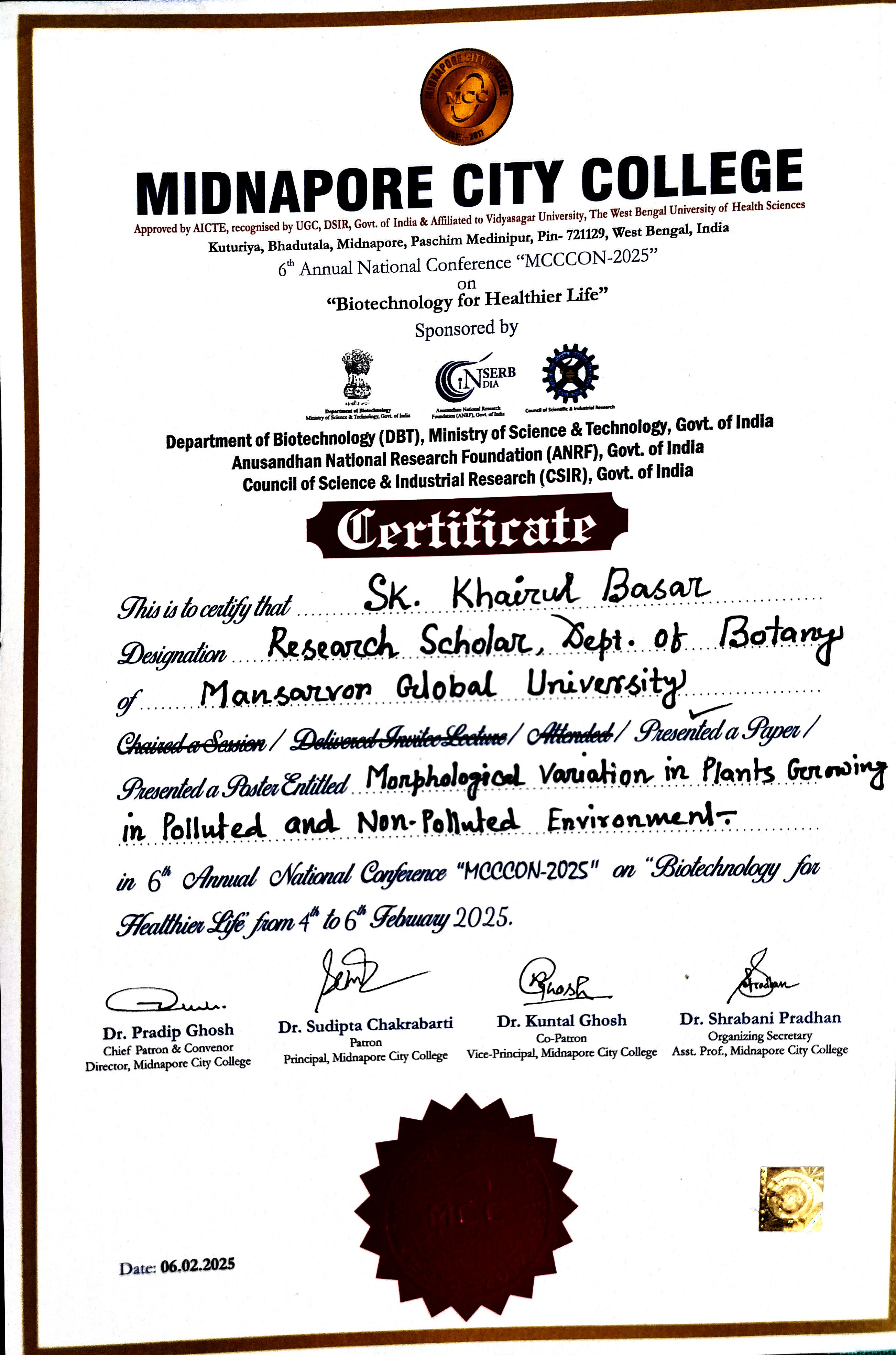 | 2 | 6 Annual National Conference MCCCON 2025 on Bio Technology for healthier Life. | Midnapore City college. | National Level | NO | Yes | Morphological variation in plants Growing in polluted and non polluted Environment . | Download |