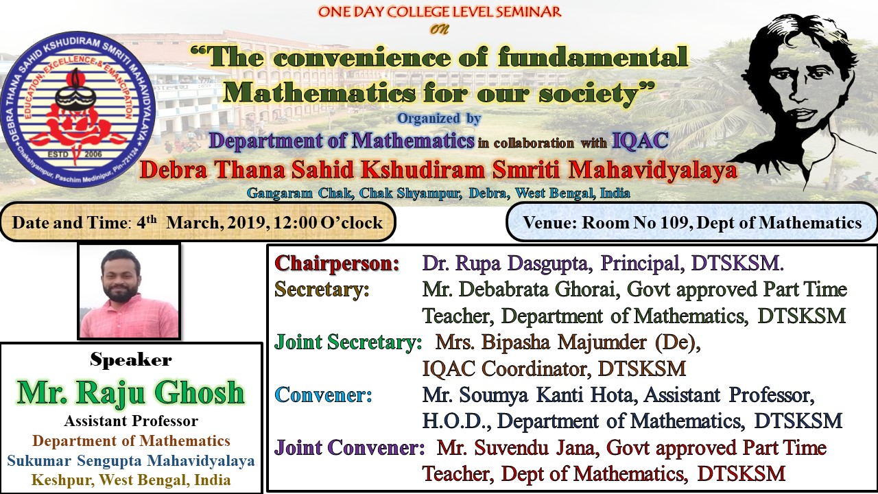 | 2 | 04 Mar 2019 | The convenience of fundamental Mathematics for our society | College Level | Seminar | Mr. Raju Ghosh Assistant Professor Department of Mathematics Sukumar Sengupta Mahavidyalaya Keshpur, West Bengal, India | 4th March, 2019 | Download |